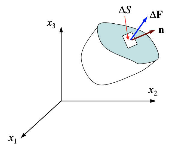 \[ \begin{aligned} \mathbf{f}_n &= \lim_{\Delta S \to 0} \frac{\Delta \mathbf{F}}{\Delta S} = \frac{\mathrm{d} \mathbf{F}}{\mathrm{d} S} \\ &= f_{n1} \mathbf{e}_1 + f_{n2} \mathbf{e}_2 + f_{n3} \mathbf{e}_3 \\ &= \sigma_n \mathbf{n} + \tau_n \boldsymbol{\tau} \end{aligned} \]