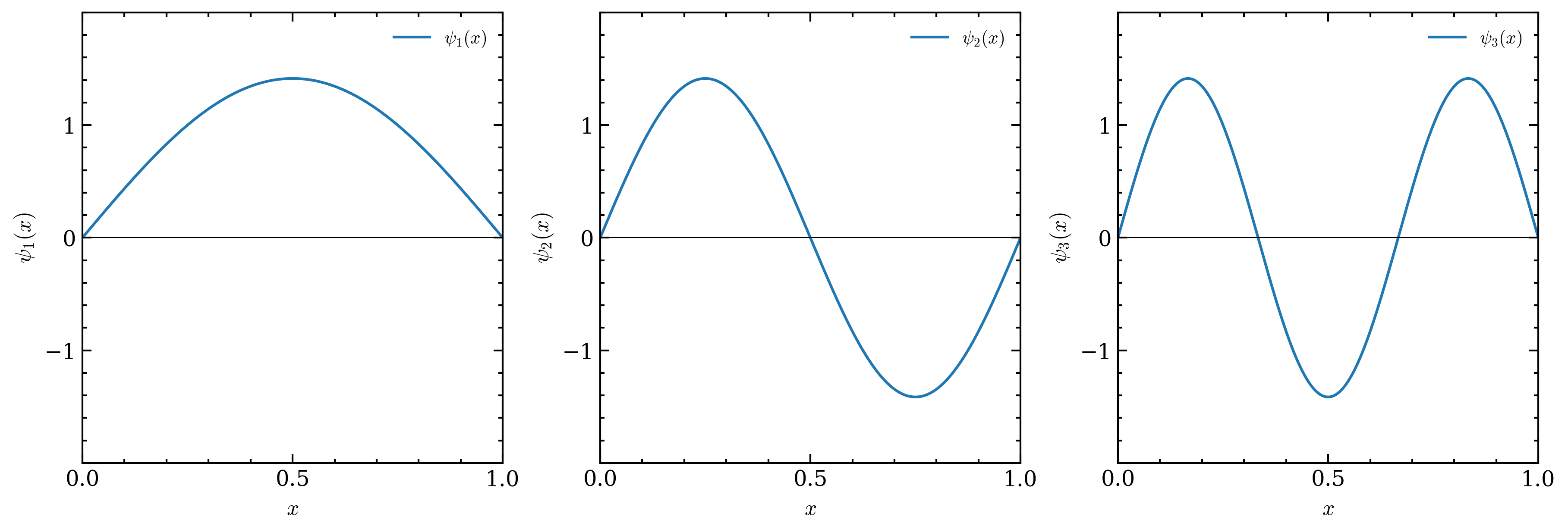 \[ \begin{equation} \label{eq:infinite_well_basis} \psi_n(x) = \sqrt{\frac{2}{a}} \sin\left(\frac{n \pi}{a} x\right), \, n = 1, 2, \ldots \end{equation} \]